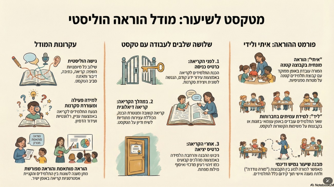 מודל הוראה הוליסטי לתִּהֲלוּךְ המפגש האורייני עם טקסטים מעולם השיח המידעי, תוך התחשבות במאפייני הטקסט ומאפייני הלומדים.